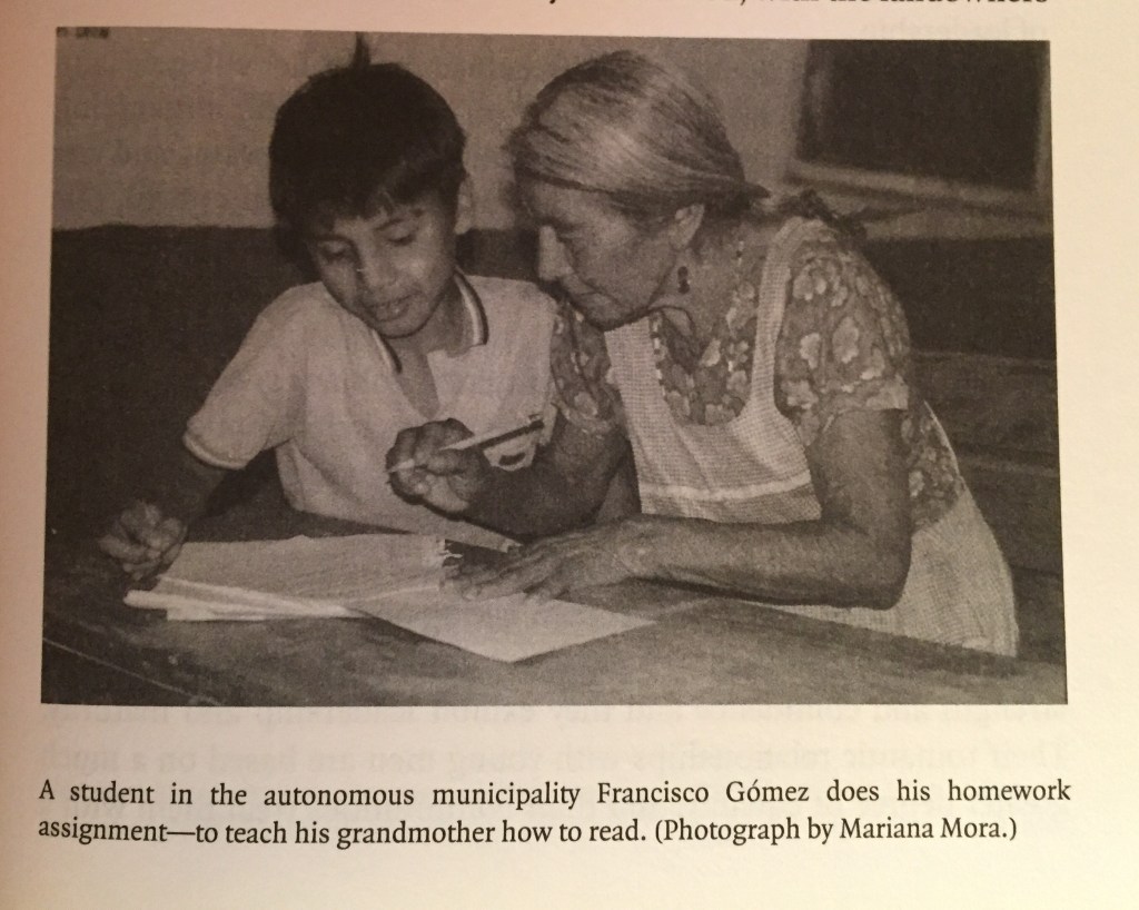 In the years since they seized over five hundred plantations on January 1, 1994 the Zapatistas have built a wide-ranging autonomous project, including founding a school in each of hundreds of communities. In these schools curriculum developed collectively by Zapatista communities is taught by Zapatista teachers in both Spanish and Mayan languages. As in so many other areas of their autonomy, the shift has been enormous, creating instances like the one pictured here (Klein, 2015, p.253).