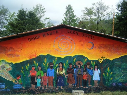 Murals abound in the Zapatista caracol of Oventic. The caracoles (literally, conch shell or spiral) are centres of autonomous government for the surrounding indigenous, peasant Zapatista communities. Their one-storey wooden structures are home to womens’ artisanal cooperatives, assembly spaces, offices of the municipal and regional levels of Zapatista self-government, medical clinics, and computer labs featuring dial-up speed internet. The institution that consistently hosts the most people is Oventic’s secondary school, where a few hundred Zapatista youth live during the weekdays and learn in both Spanish and Tzoztil languages. The school is covered in dozens of murals – nearly every square inch of the seven buildings that comprise the campus. Typical of the confused romanticization that has long been foisted upon Zapatismo, images of these murals abound on the internet, yet most of the “Zapa-tourists” who post them mistakenly attribute their authorship to the Zapatistas.